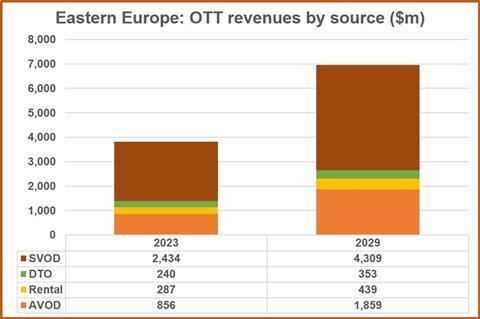 Digital TV Research said OTT (over-the-top) revenues in Eastern Europe will reach $6.96bn in 2029, up from $3.82bn in 2023.