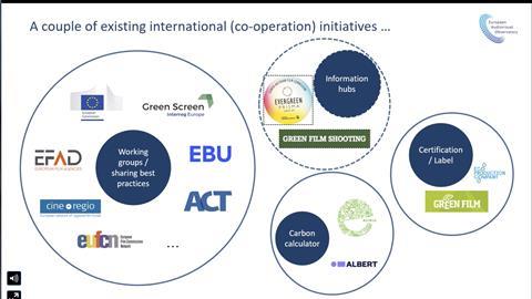 An ‘Overview of sustainable film initiatives in Europe’ was presented by Maja Cappello, the Observatory’s head of department for legal information, and its head of department for market information, Gilles Fontaine. It covered the various plans and schemes set up to move towards a green film industry across Europe. A similar topic was discussed in a later session ‘Inspiration through concrete co-operation ideas’.